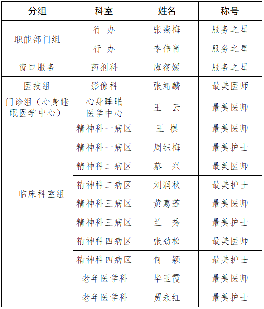 根据《荣县精神病医院评选“服务之星”活动实施方案》(荣精医发〔2024〕69号)精神,经过各组公开、公平、公正的评选,2025年第四季度“服务之星”评选工作圆满完成。