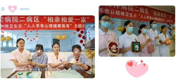 当天,医院二病区同步举办了温馨的“相亲相爱一家人——人人享有心理健康服务”主题互动活动。相关职能部门负责人、在院患者及家属代表共同参与。活动伊始,一段记录患者日常康复训练的手工视频拉开了温情序幕。漆扇、编织花、乐高……一件件精美的康复作品在现场展示,凝聚着患者们的专注与努力。在手工老师的带领下,两位患者进行了现场创作演示,充分展现了康复治疗的积极成效,赢得阵阵掌声。随后,医患合唱的《如愿》与护患共舞的《一路生花》,以艺术的形式传递出彼此的信任与对未来的希望。当在场的全体人员齐声高唱《明天会更好》时,现场气氛被推向最高潮。活动尾声,患者与家属互赠精心准备的礼物,医护人员也为每位患者送上了美好的祝福。这一刻,关怀在流淌,心与心的距离被无限拉近。