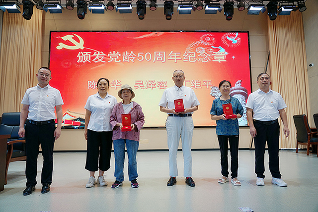 在庆祝中国共产党成立104周年之际,荣县第三人民医院党支部隆重召开党员大会,为陈万华、吴泽容、丁维平三位党龄满50年的老党员颁发“光荣在党50年”纪念章。